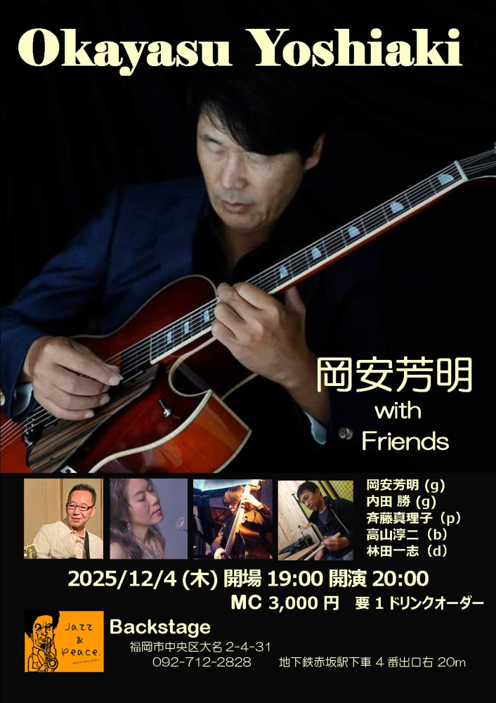 12/4(木) 岡安芳明(g) 斉藤真理子(p) 内田勝(g) 高山淳二(b) 林田一志(d) 19:00 open 20:00 start MC3,000円